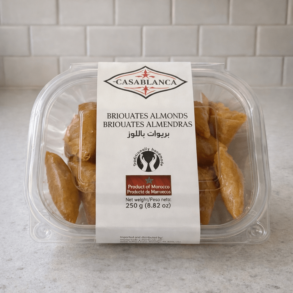 Casablanca Briwat are traditional Moroccan pastries made by Maison Seeraj from thin pastry dough, folded into triangles, filled with sweet almond paste, then fried and coated in fragrant honey syrup. Crispy on the outside and soft on the inside, they’re a classic dessert served at celebrations, with tea, or as an after-meal sweet.